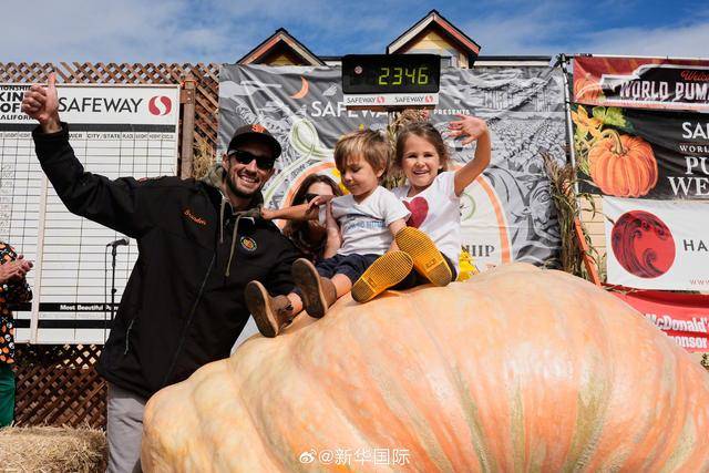 据美联社报道,夺冠后,道森兴奋地挥舞双臂,让自己两个孩子坐在这个重量相当于一辆小轿车的巨型南瓜上。